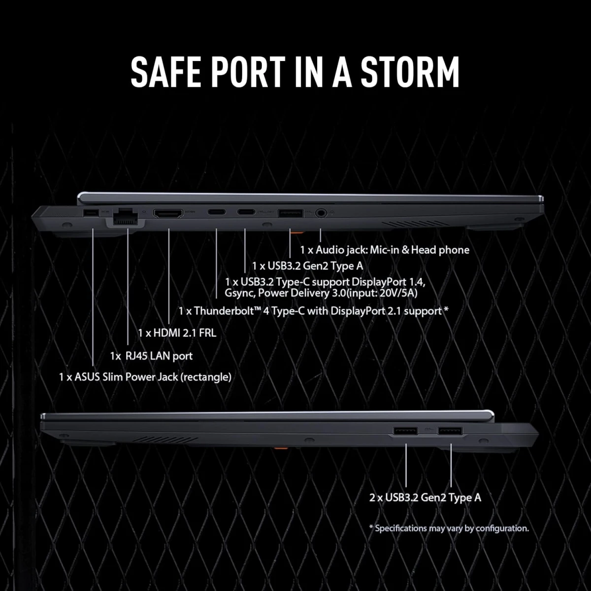 | Ports | 1x 3.5mm Combo Audio Jack 1x HDMI 2.1 FRL 3x USB 3.2 Gen 2 Type-A (data speed up to 10Gbps) 1x USB 3.2 Gen 2 Type-C with support for DisplayPort™ / power delivery (data speed up to 10Gbps) 1x RJ45 LAN port 1x Thunderbolt™ 4 with support for DisplayPort™ / G-SYNC (data speed up to 40Gbps) |